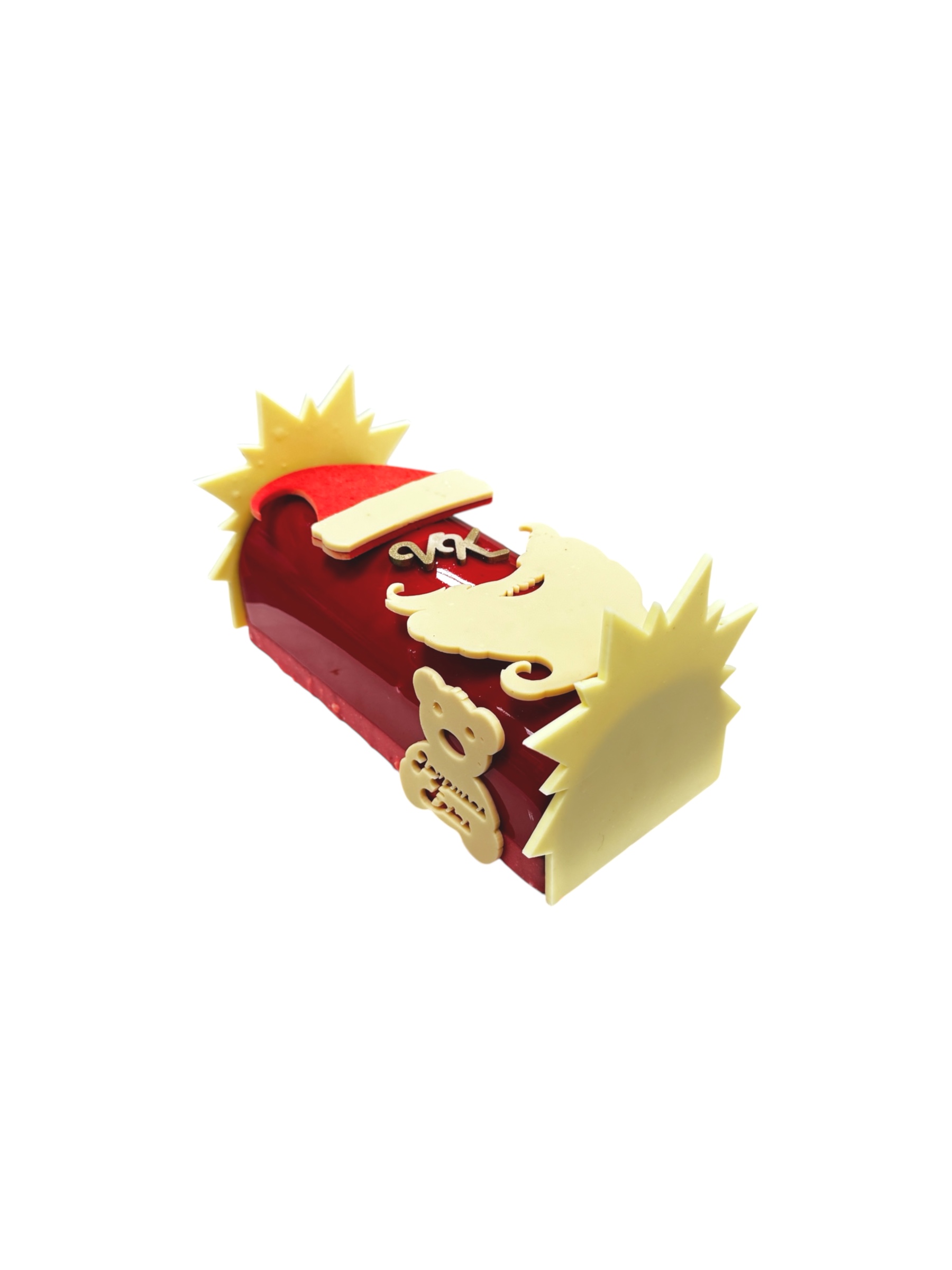 Notre bûche de Noël en forme de Père Noël capture toute la tendresse et la magie des fêtes. Sous son visage généreux et son décor festif se révèle une harmonie de saveurs fruitées et gourmandes :