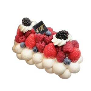 Biscuit sablé breton, biscuit madeleine, crémeux à la framboise, mousse légère aux fruits rouges.